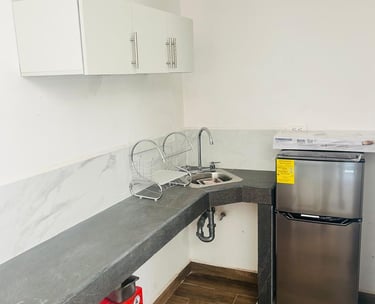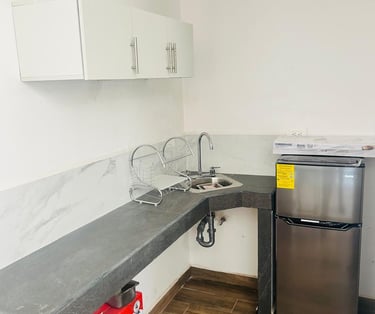 Cocineta equipada (microondas, cafetera y refrigerador)